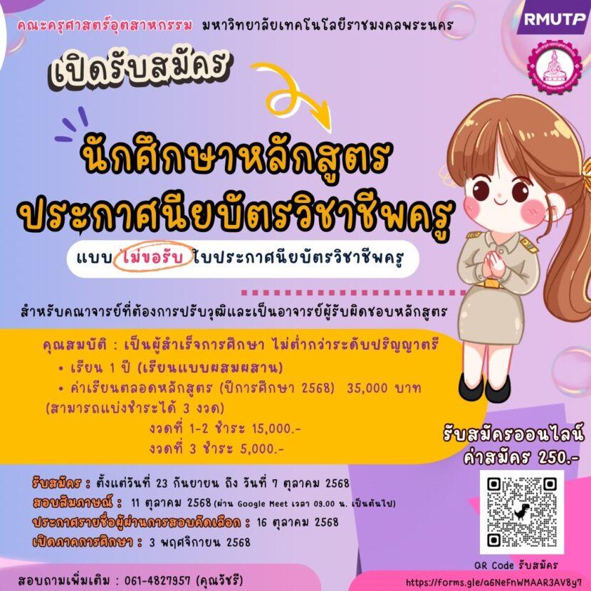 คณะครศาสตร์อตสาหกรรม มหาวิทยาลัยเทคโนโลยีราชมงคลพระนคร เปิดรับสมัครนักศึกษาหลักสูตรประกาศนียบัตรวิชาชีพครู แบบไม่ขอรับใบประกาศนียบัตร วิชาชีพครู […]