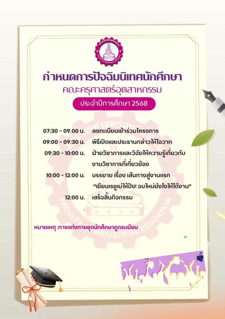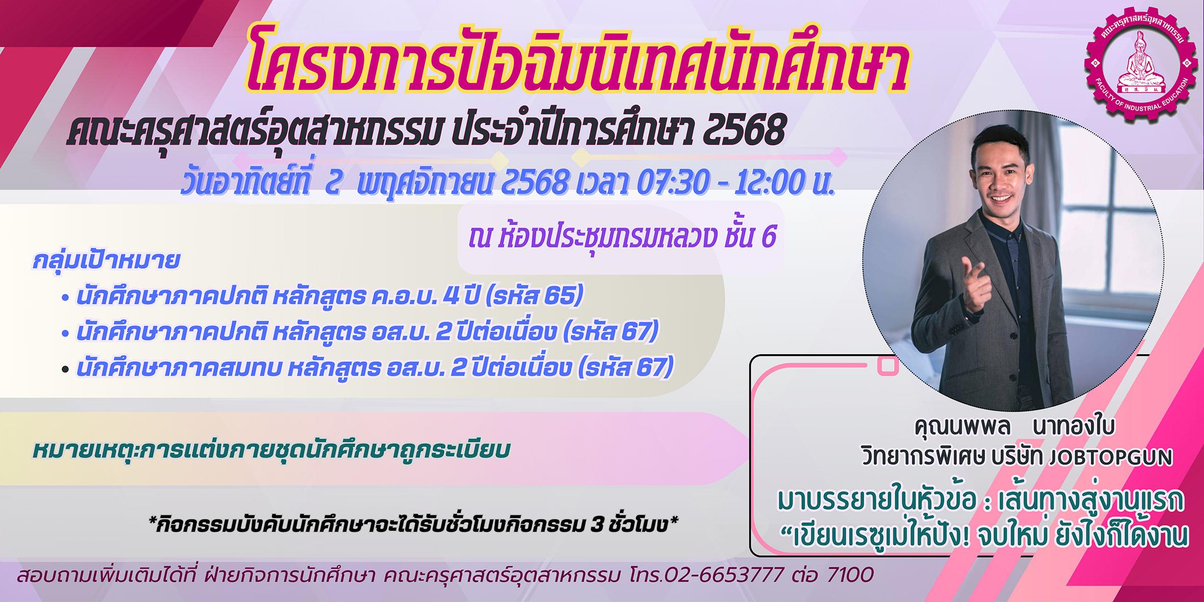 คณะครุศาสตร์อุตสาหกรรม ประกาศกำหนดการโครงการปัจฉิมนิเทศนักศึกษา ระดับปริญญาตรี ประจำปีการศึกษา 2568 ในหัวข้อ “เขียนเรซูเม่ให้ปัง! จบใหม่ยังไงก็ได้งาน” โดย คุณนพพล นาทองใบ ตำแหน่ง : วิทยากรพิเศษ บริษัท JOBTOPGUN จำกัด บรรยาย ให้แก่นักศึกษา ในวันอาทิตย์ที่ 2 พฤศจิกายน 2567 เวลา 07:30-12:00 น. โดยมีกลุ่มเป้าหมายดังนี้