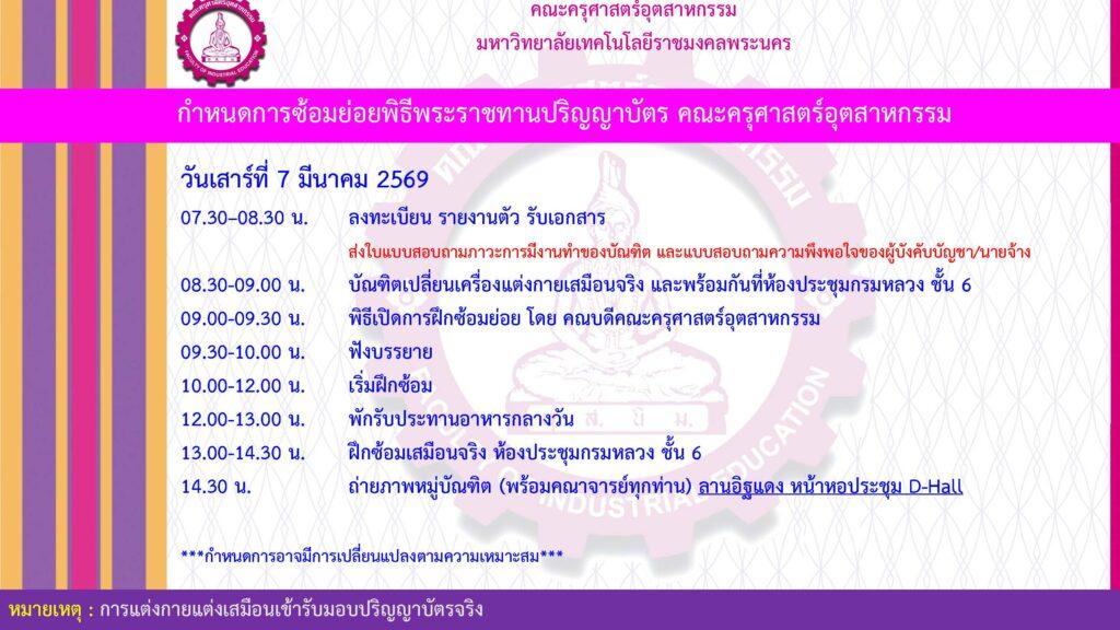 คณะครุศาสตร์อุตสาหกรรม มหาวิทยาลัยเทคโนโลยีราชมงคลพระนคร ประกาศแจ้งกำหนดการฝึกซ้อมและพิธีพระราชทานปริญญาบัตร ครั้งที่ 39 ประจำปีการศึกษา 2567