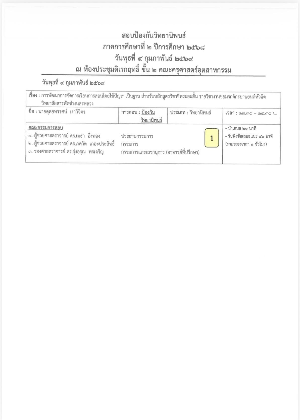 ประกาศกำหนดการสอบป้องกันวิทยานิพนธ์ ระดับปริญญาโท หลักสูตรหลักสูตรครุศาสตร์อุตสาหกรรมมหาบัณฑิต สาขาวิชานวัตกรรมและเทคโนโลยีอุตสาหกรร