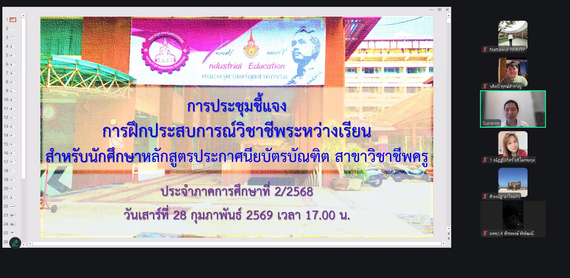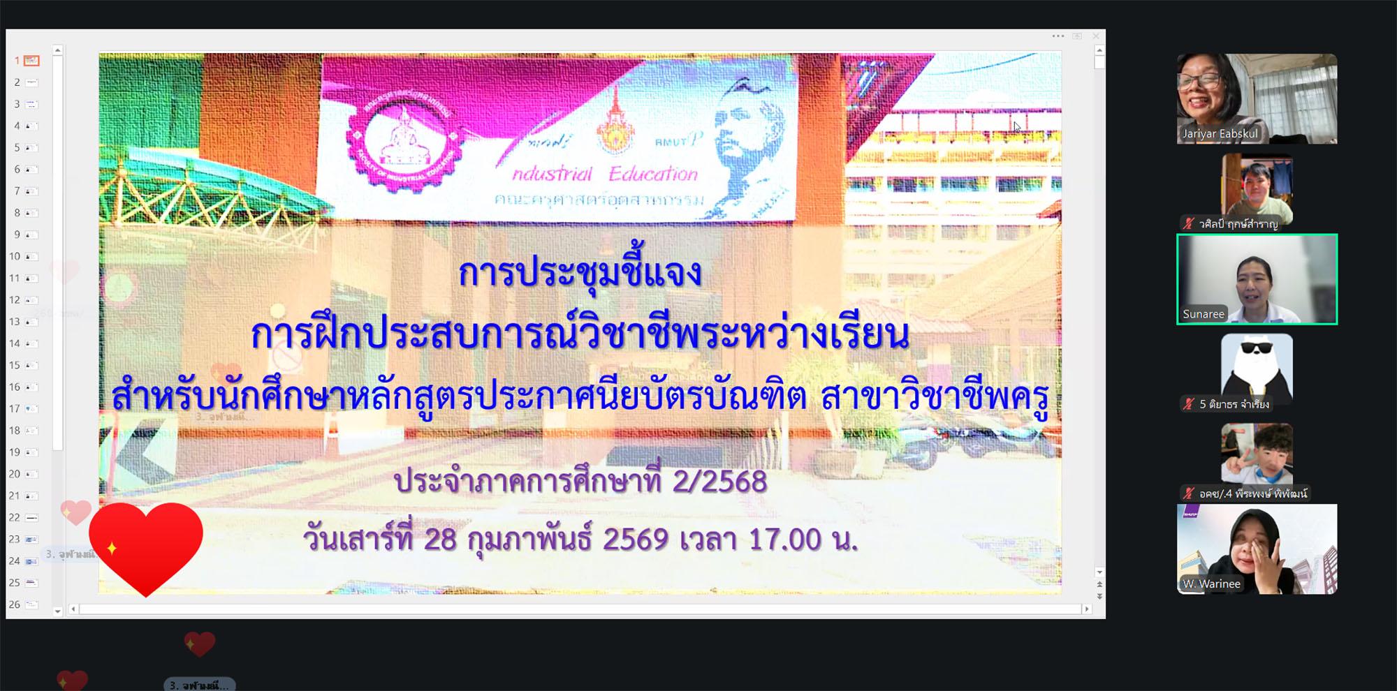 คณะครุศาสตร์อุตสาหกรรม จัดกิจกรรมปฐมนิเทศการฝึกประสบการณ์วิซาซีพครู หลักสูตรประกาศนียบัตรบัณฑิต สาขาวิชาชีพครู รุ่น 2/68 โดยมี รองศาสตราจารย์ ดร.รุ่งอรุณ พรเจริญ คณบดีคณะครุศาสตร์อุตสาหกรรม กล่าวเปิดงาน ภายในงานมีการบรรยายและชี้แจงแนวทางฝึกประสบการณ์วิซาซีพครู และแบบประเมินผลฯ และตอบข้อซักถาม ในรูปแบบออนไลน์ ผ่านระบบ Zoom วันเสาร์ที่ 28 กุมภาพันธ์ 2569