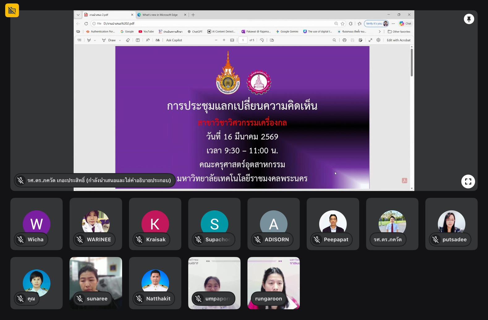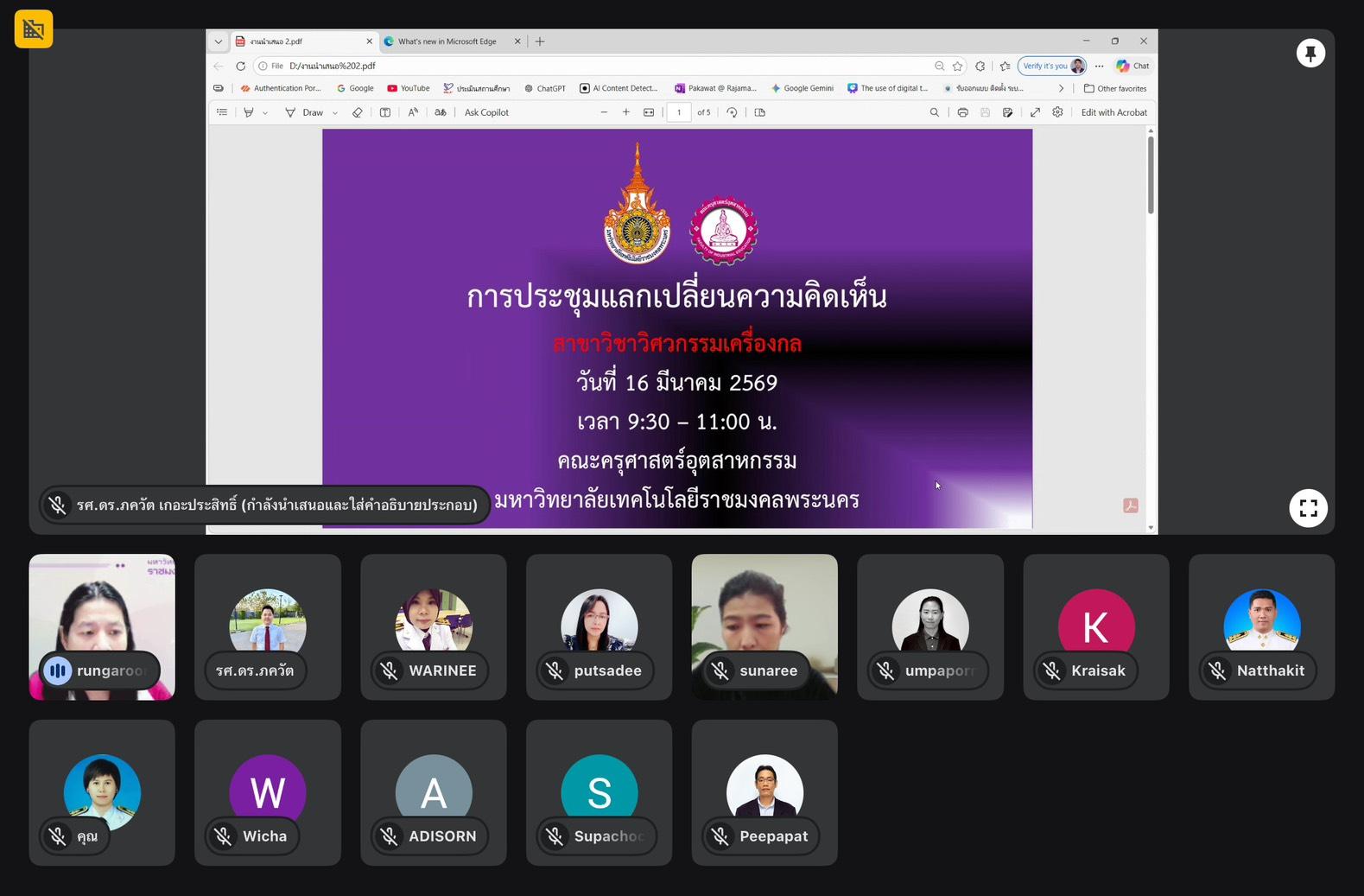 รองศาสตราจารย์ ดร.รุ่งอรุณ พรเจริญ คณบดีคณะครุศาสตร์อุตสาหกรรม พร้อมทีมผู้บริหาร จัดประชุมพบปะพูดคุยสาขาวิชาวิศวกรรมเครื่องกลและสาขาวิชาวิศวกรรมอุตสาหการ โดยมีการพูดคุย ปรึกษาหารือ แลกเปลี่ยนความคิดเห็น และร่วมกันตัดสินใจในเรื่องที่เกี่ยวข้องการพัฒนาคณะ เช่น แนวทางการรับนักศึกษาปีการศึกษาใหม่ใช้งานคุรุภัณฑ์ร่วมกันแนวทางการเรียนการสอน และ แนวทางการจัดหารายได้ปัญหาอุปสรรคสภาพแวดล้อมการเรียนการสอนทุนการศึกษา เป็นต้น โดยมีจุดประสงค์เพื่อให้สาขาวิชาได้มีส่วนร่วมในการพัฒนาคณะ ในรูปแบบออนไลน์ เมื่อวันที่ 16 มีนาคม 2569