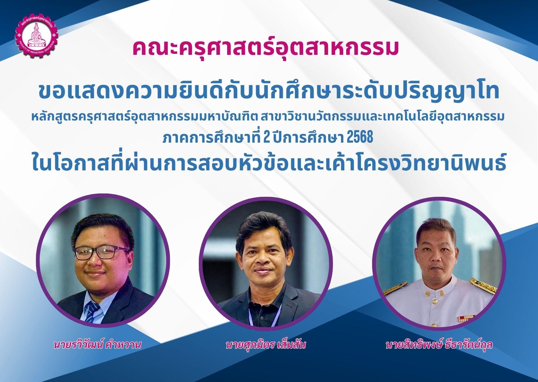 คณะครุศาสตร์อุตสาหกรรม ขอแสดงความยินดีกับนักศึกษาระดับปริญญาโท ในโอกาสที่ผ่านการสอบหัวข้อและเค้าโครงวิทยานิพนธ์ หลักสูตรครุศาสตร์อุตสาหกรรมมหาบัณฑิต สาขาวิชานวัตกรรมและเทคโนโลยีอุตสาหกรรม ภาคการศึกษาที่ 2 ปีการศึกษา 2568 ณ ห้องประชุมดิเรกฤทธิ์ คณะครุศาสตร์อุตสาหกรรม เมื่อวันที่ 26 มีนาคม 2569 น. ในหัวข้อดังต่อไปนี้