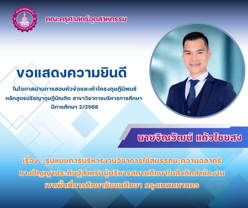 ขอแสดงความยินดีกับ นายจิณวัฒน์ แก้วไชยสง ในโอกาสผ่านการสอบหัวข้อและเค้าโครงดุษฎีนิพนธ์หลักสูตรปรัชญาดุษฎีบัณฑิต สาขาวิชาการบริหารการศึกษา